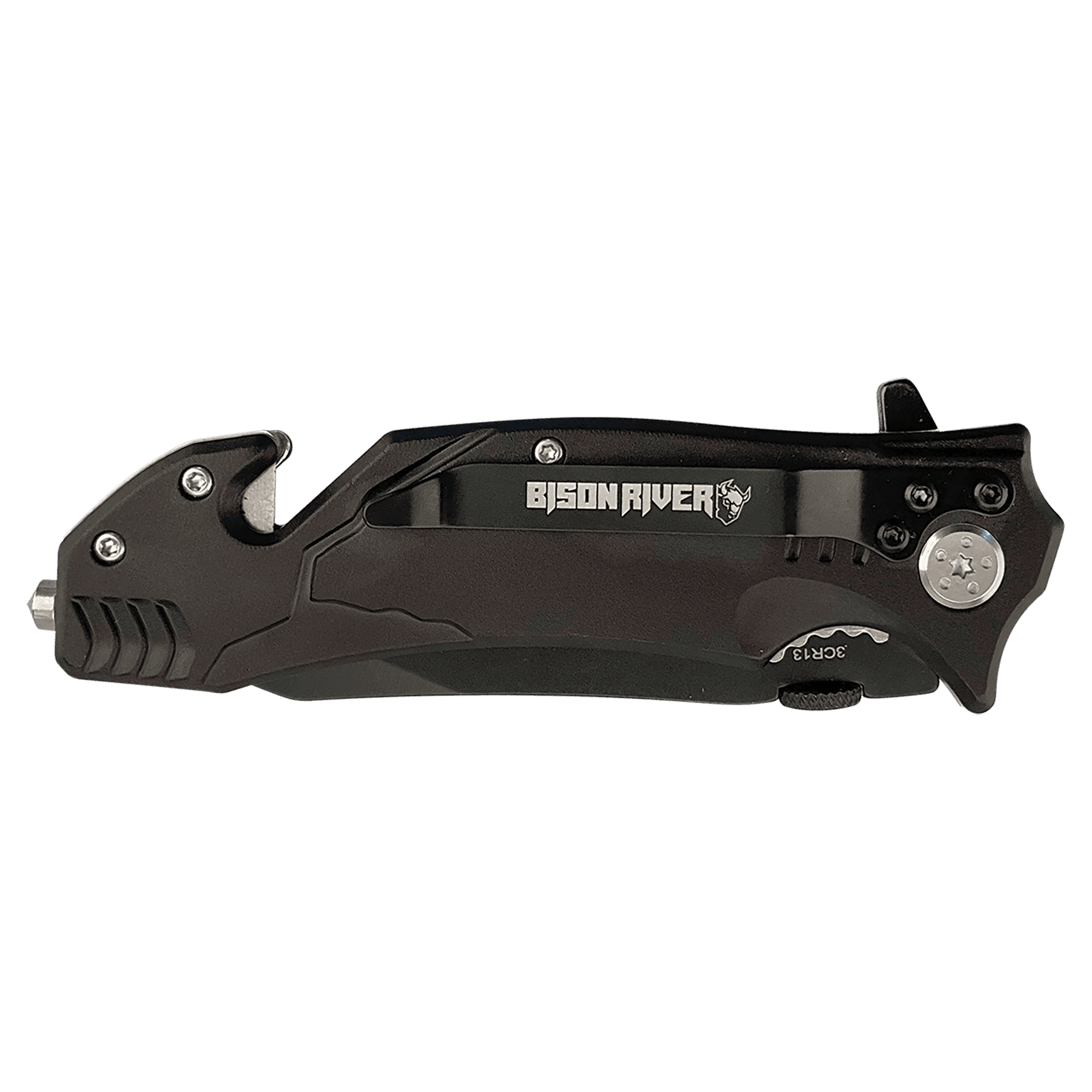This aluminum spring assisted knife with a clip features a stainless steel blade, glass breaker, and seatbelt cutter. It's perfect to keep in your vehicle in case of emergencies where you need to be able to make a quick exit. Available in three colors, it's a gift or incentive that could save lives. Packaged in a Bison River branded box, this knife is also available with a wood handle. Blade: 3 1/2" x 1" x 1/16"